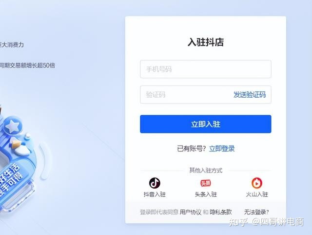 准备好材料后,就可以开始入驻店铺了。首先注册摇一摇店。建议直接用手机号注册。不要使用Tik Tok,头条新闻或火山来登录。