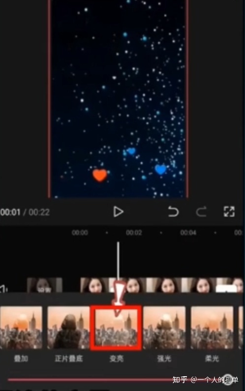 然后选中第一张照片,把时长调整为1-2秒,然后再选中第二张照片,把持续时长调整成7-8秒,在第二张照片的开头增加一个画中画,导入我们一开始选好的爱心视频素材,点击混合模式里边的变亮,再导入一个纯蓝色的图片,选中这个蓝色图片之后,然后再给它选择正片叠底的混合模式,