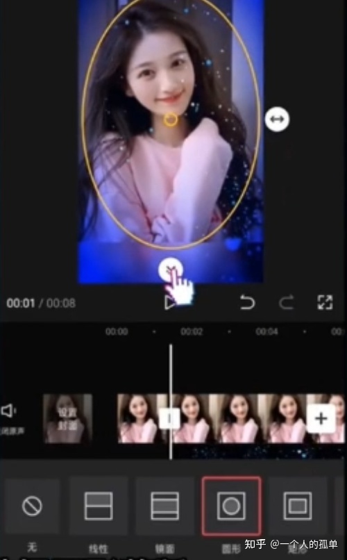 混合模式调整好之后,点击蓝色图片,点击中间的蒙版,选择里面的圆形模板,调整圆形边框的大小,圈出文字就可以了。用手指点击其框架底部的箭头,拉出一点羽化效果,然后选择第二张图片,点击底部的Tik Tok游戏,我们将为其添加卡通效果。