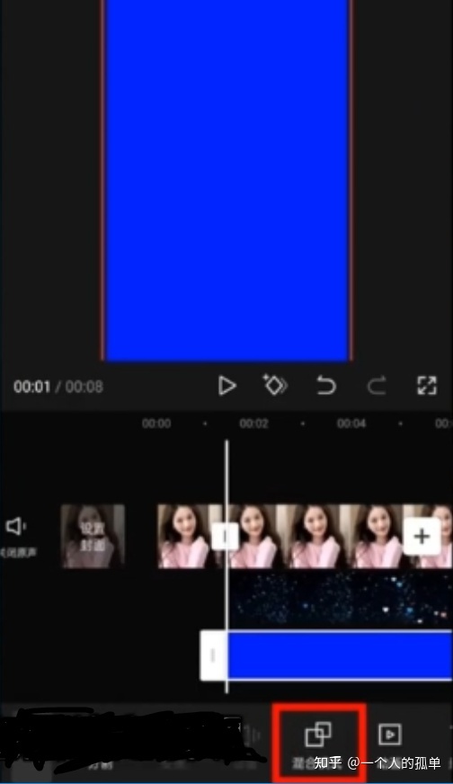 然后选中第一张照片,时长调整为1-2秒,再选中第二张照片,时长调整为7-8秒,在第二张照片的开头添加一张画中画,导入我们一开始选择的爱情视频素材,在混合模式下点击提亮,然后导入一张纯蓝的图片。选中这张蓝色图片后,再给。