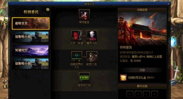 1.每周委托任务分为根特宫、切斯特镇(一)、鬼域时空、切斯特镇(二)四个区域。不同区域难度不同,玩家只需选择一个区域即可完成任务。