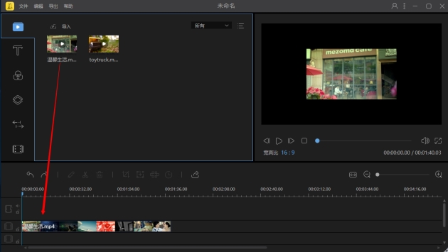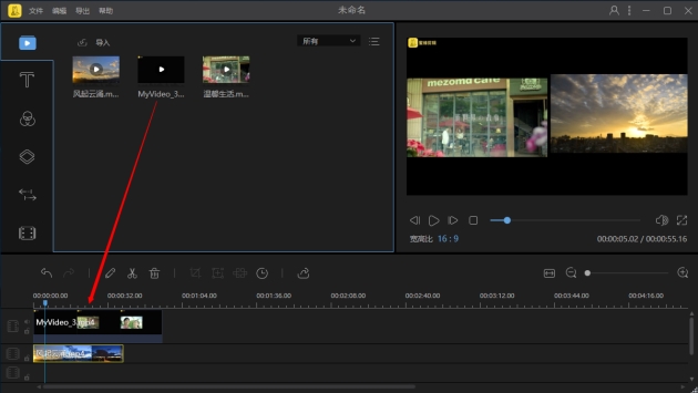 ? 3、将导出的视频拖入软件中,拖至下方视频编辑轨道,然后将第二个视频剪辑拖至下方画中画轨道。到