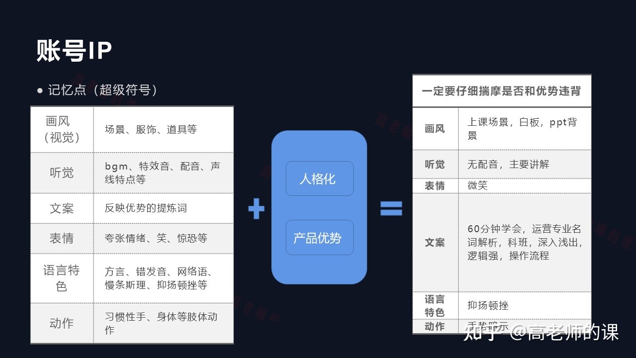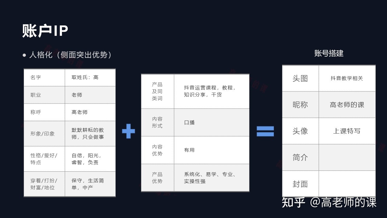 【/br/】IP个性化+内容优势和产品优势,会规划账号吗?头图、昵称、头像、简介、封面是展现你的账号IP最重要的五个部分,也就是人们通常所说的账号定位。嗯,根据这两张表来设计这五个内容,既准确又简单。