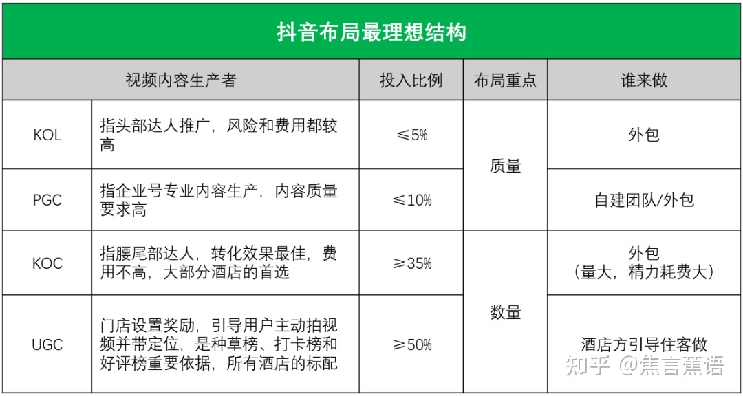 上面的模型就是最好的例子。很多酒店其实只适合UGC和KOC,尤其是Tik Tok那些还处于冷启动阶段的酒店。目前Tik Tok也对开店人才给予更多的支持,所以我们可以看到很多人花足够的钱买1000个粉在Tik Tok注册成为开店人才,这是一个人创业带货的大好场景。基于此,除了必须要做的UGC,建议KOC投入比例最高。
