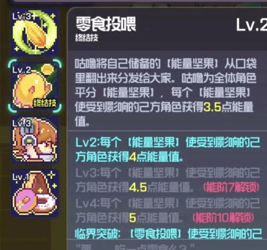 咕鲁的终极技能是喂零食。必要的时候,他会把自己储备的坚果翻出来分发给队友。吃了它们后,他可以恢复他的全部力量。游戏过程中会有相应的剧情提示,增加玩家的代入感。