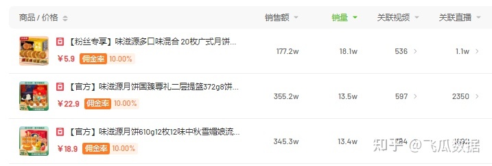 根据飞瓜的商品数据,过去30天月饼销售额达7亿,GMV增长率为94.07%。