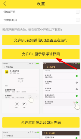 3、如果没有出现浮球,您还需要滑动到页面底部,通过“允许Biu显示浮球权限”启用浮窗的权限。