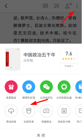 3、另外,在阅读小说的同时,我们还可以通过右上角的按钮调出菜单列表,找到并设置“私人阅读”模式!