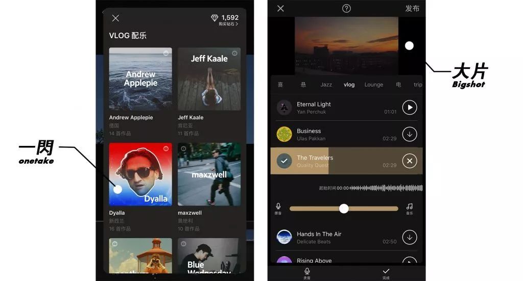 《闪光》和《大电影》都内置了各类bgm,而且还有专门的vlog配乐区,bgm质量很高。