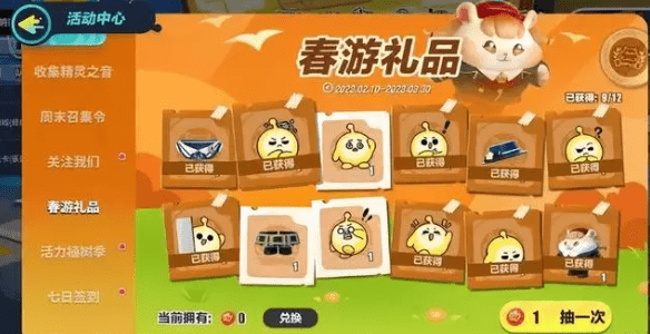 2.进入【活动中心】后,玩家选择【春游礼物】活动,需要根据任务的提示完成各种春游任务,积累一定数量的兑换道具即可抽取奖励。点击抽奖一次,随机获得各种道具,还有免费皮肤可以抽奖。