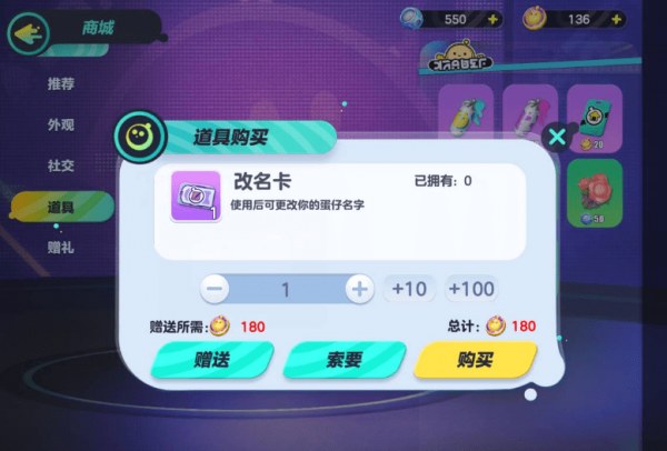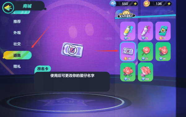 然后点击【道具】,这样就可以看到改名卡了。您可以使用重命名卡来修改昵称。