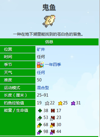 2.玩家可以在任何时间、任何天气下到矿井的第20层、第60层、第100层钓鱼。另外,击杀幽灵时还有小概率掉落幽灵鱼。