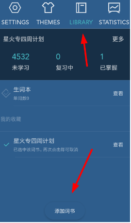 3、之后,重新进入软件的“LIBRARY”功能页面,选择底部的“添加单词书”选项,上传自定义单词。