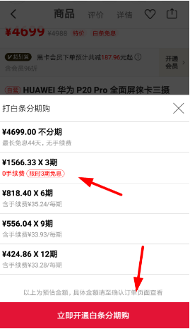 2.接下来滑动找到下方的“白条”选项。对于某些打折产品,用户甚至可以享受3次免息优惠。