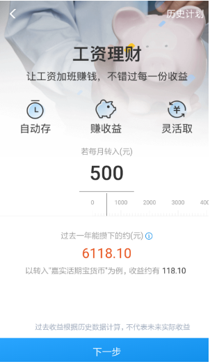 2.接下来,您需要设置每月转账金额,可以通过滑动上方进度条进行调整,然后选择底部的“下一步”功能。