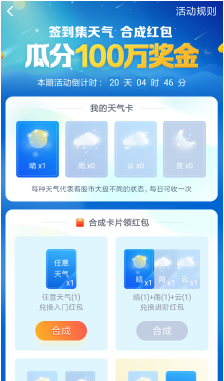 操作方法其实很简单。只需每天签到领取天气卡即可领取卡片。合成后即可瓜分100玩现金红包奖励。