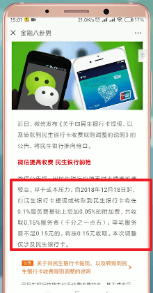 微信最新发布的新规明确规定,自2018年12月18日起,使用微信支付向民生银行卡取款、转账,手续费在原0.1%的基础上,另加收0.05%的附加费。合计0.15%,单笔最低0.15元。到