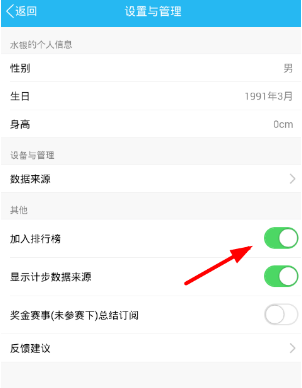 3、之后在设置和管理页面底部找到“加入排行榜”功能,您可以通过右侧的按钮退出并关闭团体锻炼排名,以保护自己的锻炼数据。