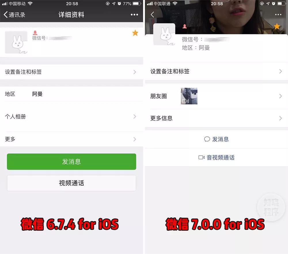 用户“详情”页面的更新可能更多是为了迎合“时刻视频”功能的上线。在iOS版微信7.0.0中查看好友信息时,可以在顶部看到对方最近上传的“时刻视频”,下拉页面会全屏播放该视频。