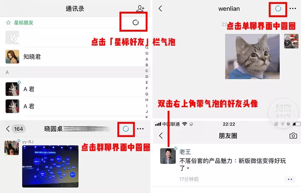在通讯录、朋友圈、单聊、群聊中,只要好友头像右上角出现蓝色气泡,就表示他或她发布了新的“朋友圈视频”。
