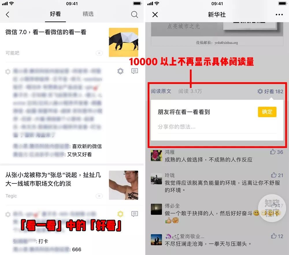 伴随本次更新,公众号文章中改版后的——微信文章底部原来的“赞”改为“好看”。当你的朋友认为一篇文章“好看”时,你可以在“看看”中看到该文章和推荐对象。