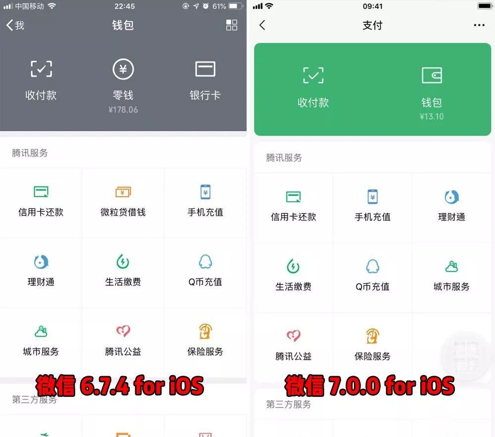 iOS版微信7.0.0中,“我-钱包”入口更换为“我-支付”。