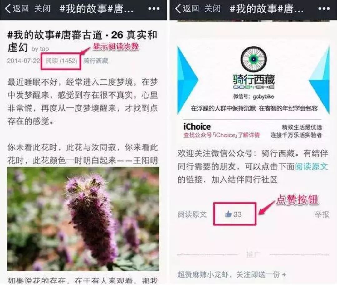 2014年7月23日晚,“骑行西藏”公众号推送的文章首次出现浏览量和点赞数,随后流量主和广告商服务公测。
