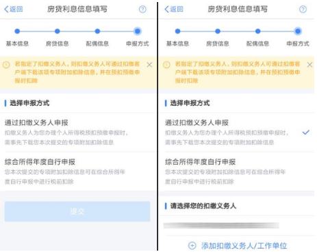 3、全部信息填写完毕后,软件为您提供“通过扣缴义务人申报”、“年度综合收益自行申报”两种扣除方式。区别在于单位声明和个人声明。根据情况选择!