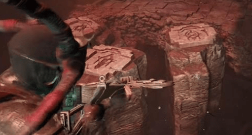 拿到之后就可以去放舞曲的位置了。用十字弓瞄准你要走过去的石柱,这样你就可以走过去。