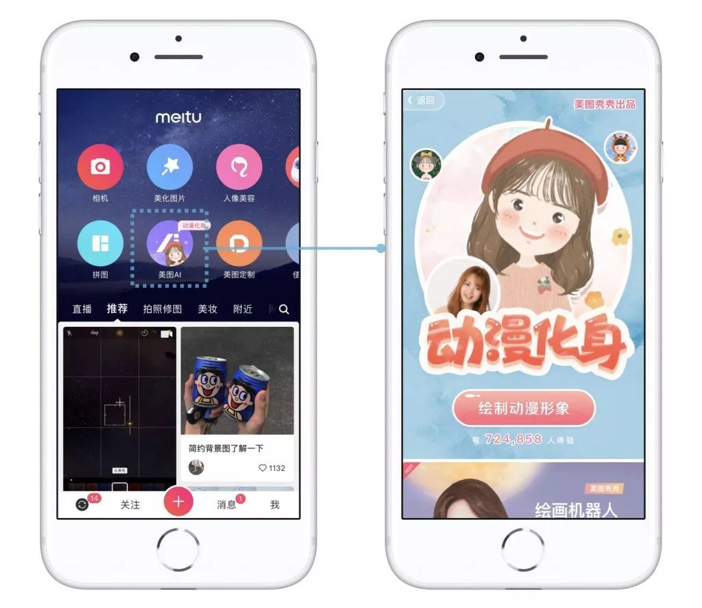 为了保证更好的识别和制作效果,尽量选择正面、半身、脸部不被遮挡的照片。拍照后稍等片刻,美图AI就会为你生成一个可爱的动漫头像。