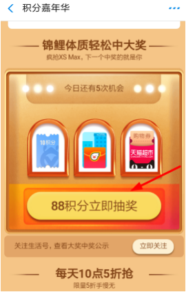 3、此外,滑动到页面底部还可以花费88蚂蚁积分进行抽奖,用户还有机会从中抽奖iPhone XS实物奖励!