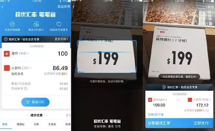 目前,支付宝的“智能扫码”功能支持港币兑换人民币、日元兑换人民币。用户可以扫描二维码查看这两个支持支付宝支付的地区的价格,使用起来非常方便。