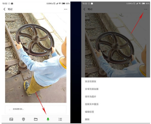 步骤2.点击笔记页面左下角的“图片”图标,选择要发送的照片,然后点击第四个“麦克风”按钮录制你想说的内容。