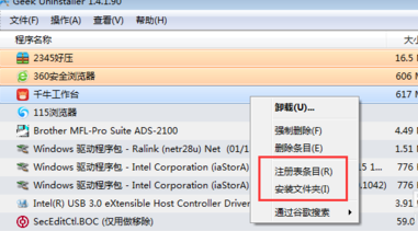 6、GeekUninstaller不仅卸载程序好用,而且还可以右键点击某个程序来查看该程序的注册表项和安装文件夹,特别方便。到