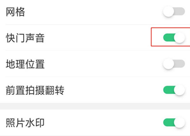 第三步:找到【快门声音】,点击右侧按钮将其关闭(灰色表示关闭,绿色表示开启)。设置完成后,用手机拍照就不会有声音了。赶紧拿起手机来试试吧!
