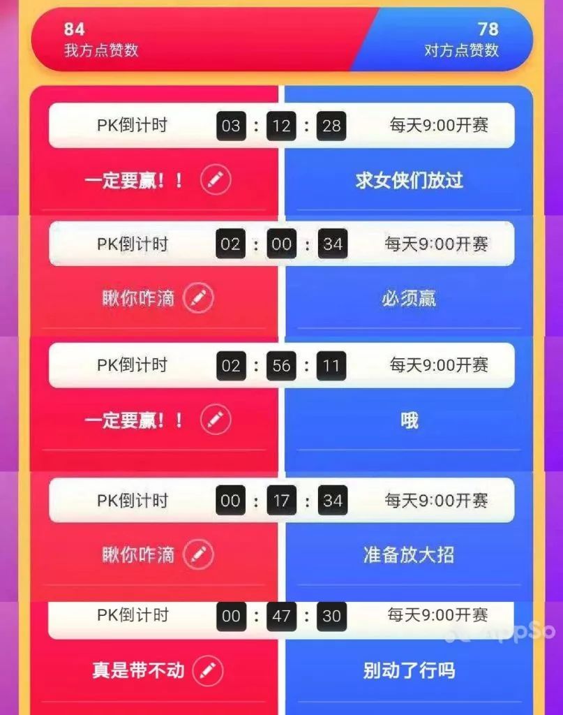 PK活动时间为每天上午9:00至晚上11:00。原本只是简单的根据点赞数来决定,却催生了各种战术。有的一马当先,让你早早投降,有的相持突然,有的用实力让对手措手不及,有的改队名暗示对手打“默契球”…… 11激发了大家的军事才能。
