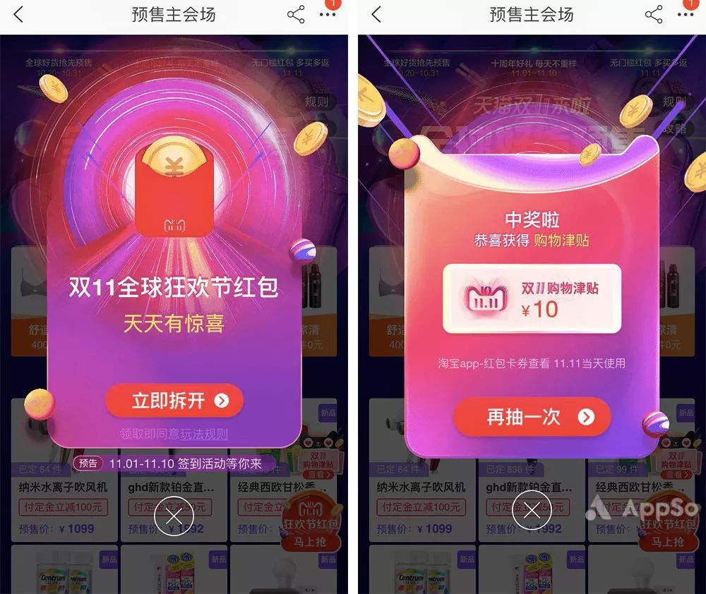 每天可领取3次,随机领取现金抵扣或双11购物红包