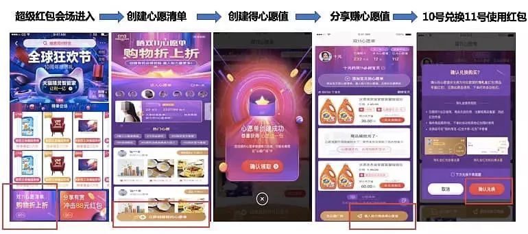 11月1日起,用户可以将自己喜欢的商品添加到“双11心愿单”,并通过分享获得好友帮助,获得心愿值奖励。 11月10日晚上11点后心愿值可兑换专属商品红包,用于当日双11订单折扣,兑换比例为1:1。