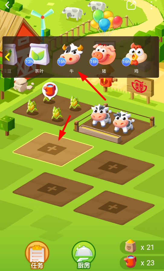 如果将列表向左滑动,您可以找到牛图标并单击将其领养到农场。这些家畜动物需要吃饲料16个小时才能成熟。您可以通过点击农田来喂养饥饿的动物。到