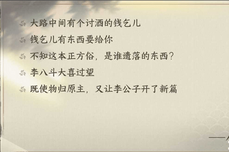 1.玩家需要找到【桃溪村】的npc【钱】,与他对话,给他一坛【桃花雪】。