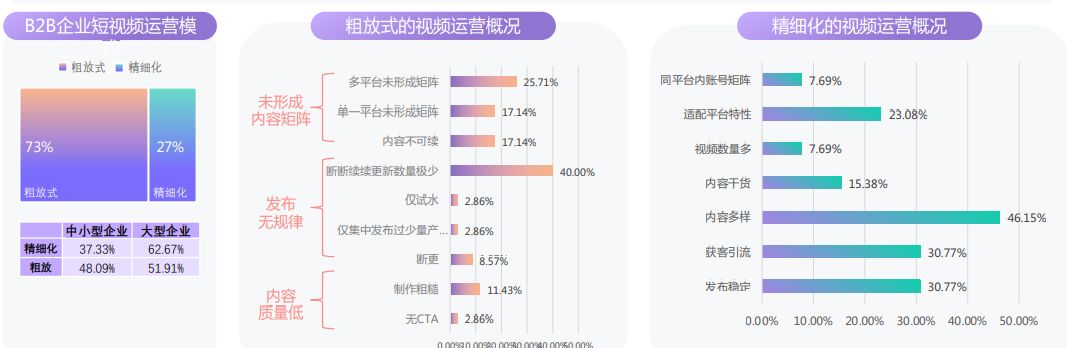 当我们深入到B2B企业的各个平台的账号中,会发现超过一半的企业都是以粗放的运营模式来处理短视频账号。这些企业账号不仅视频数量少,而且视频内容和平台单一,制作相当粗糙。