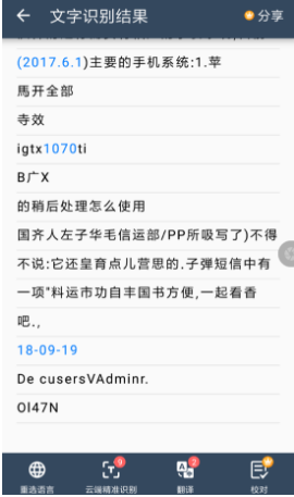 3、文字识别完成后,我们可以选择底部功能列表中的“翻译”功能,对新识别的文字进行转换。