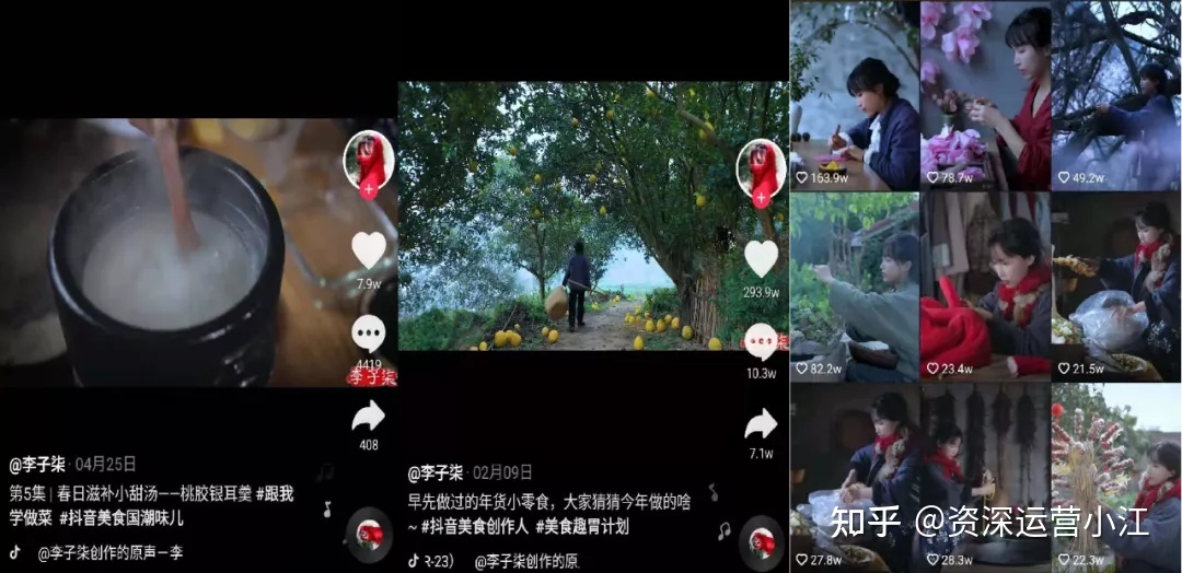 比如@李子奇,从首页可以看出,她通过中式服装、田园风光、家乡特产、男耕女织之类的农村生活,让内容变得温馨有趣...食物不再是单一的元素,富有想象力和创造力的食物结合了图片。