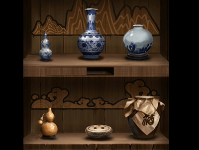 5.把所有的瓷器放在右边的柜子上,如图。