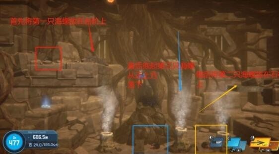 1.注意深海温泉的喷发,找到三个海螺,分别堵住三个深海温泉的喷发口。
