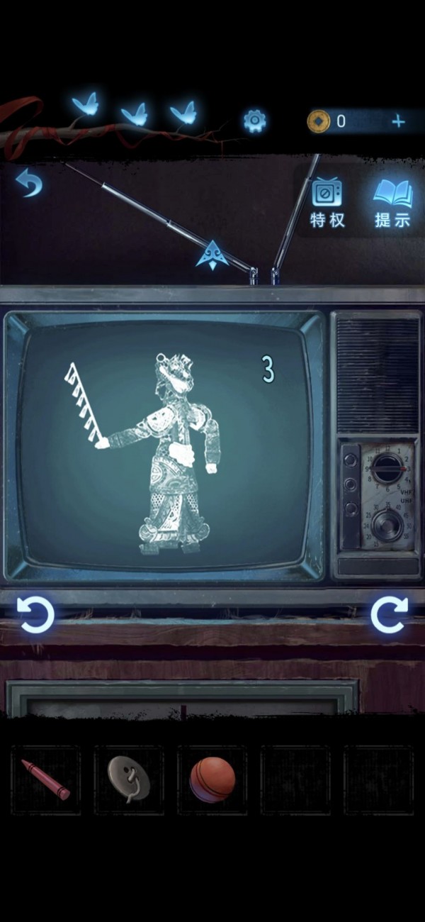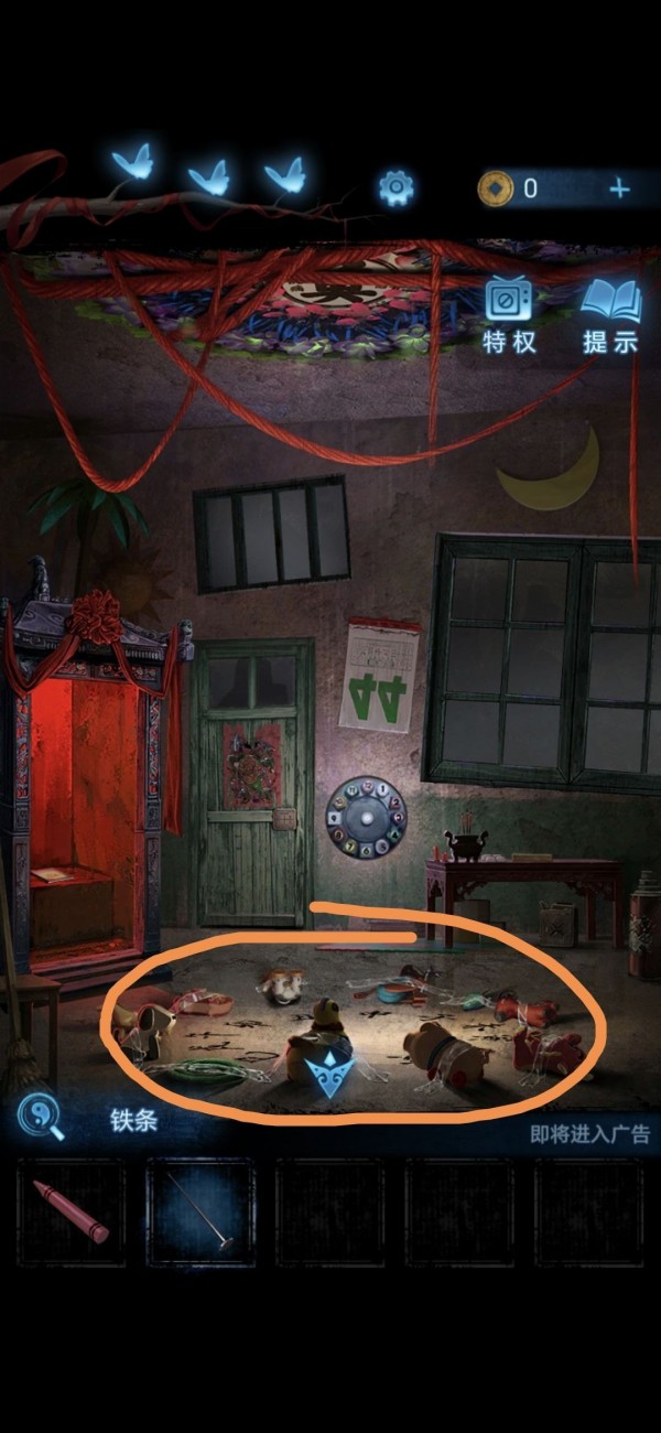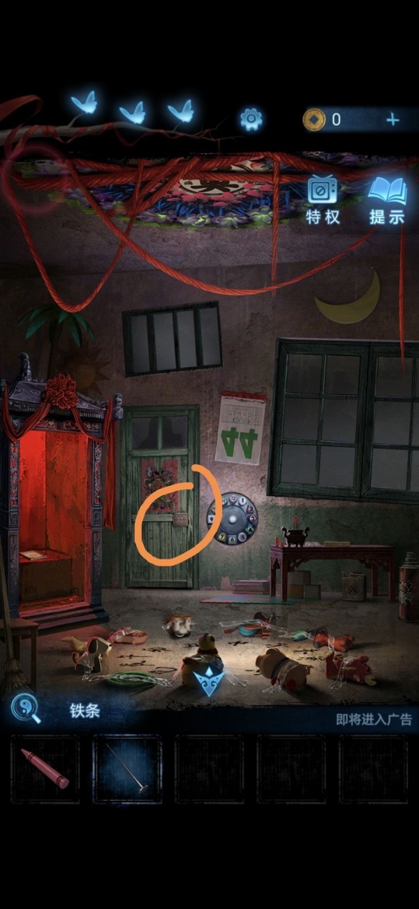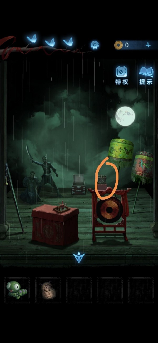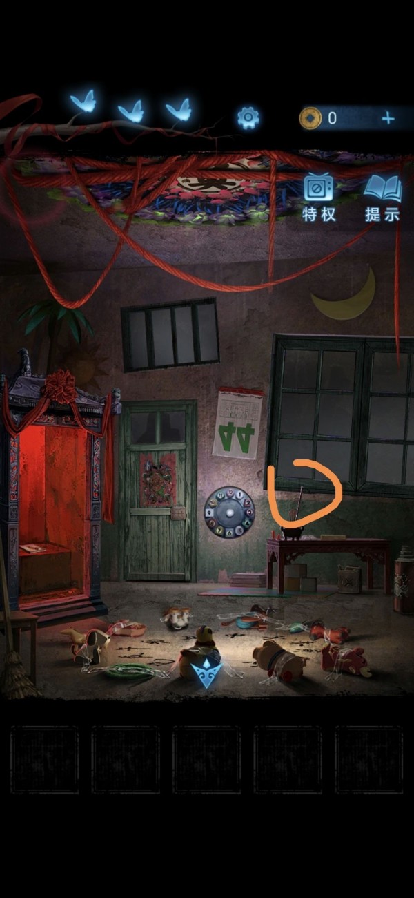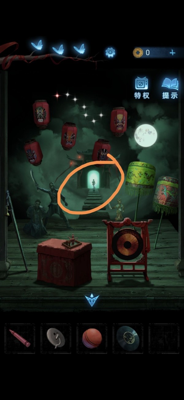 点击中间的门来切换星星的数量。根据电视上刚刚出现的画面,画面右上角的数字是星星的数量。当达到相应的星数时,拨图中相应的东西,即一星拨钟,三星拨皮影戏,五星敲锣,六星拨伞,七星拨酒壶,直至五盏灯笼全部点亮。