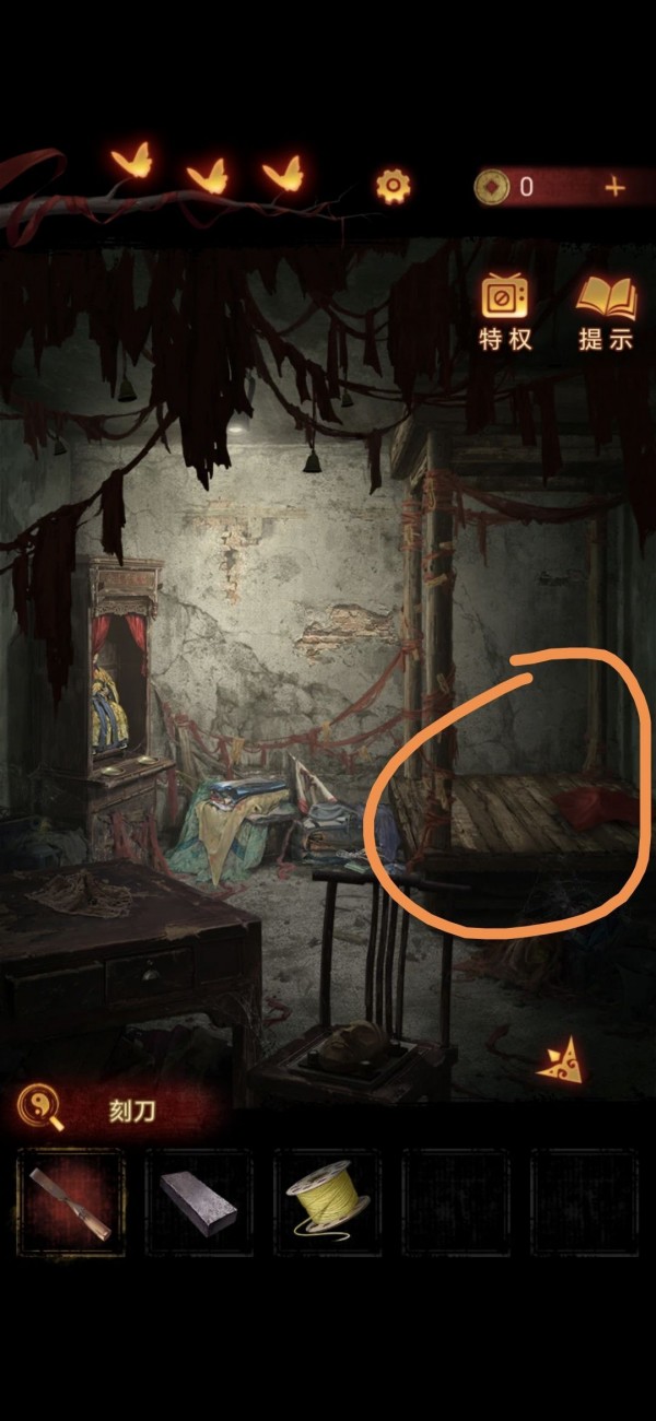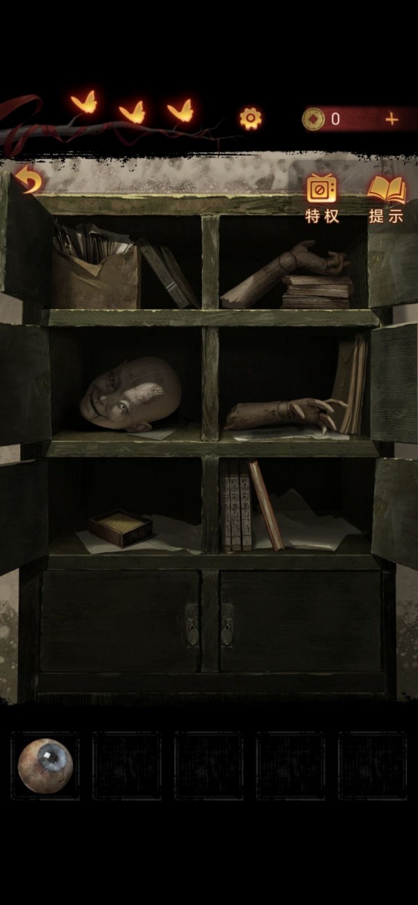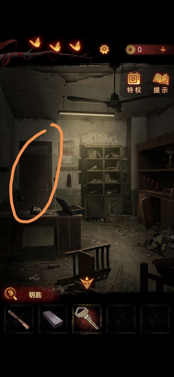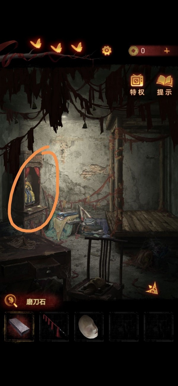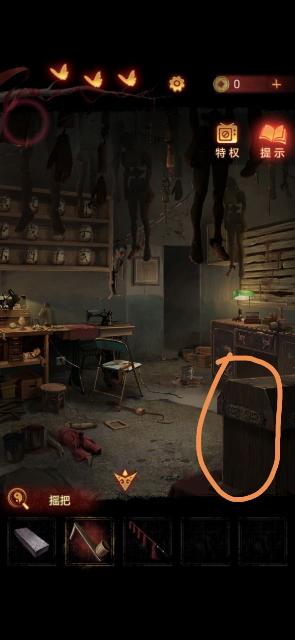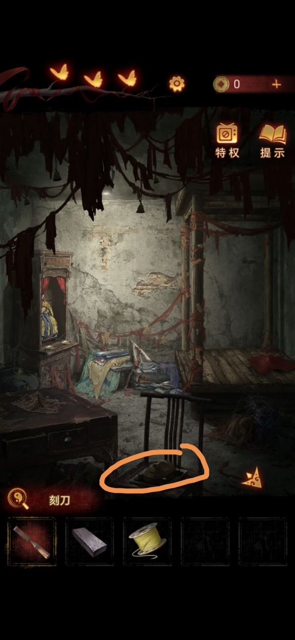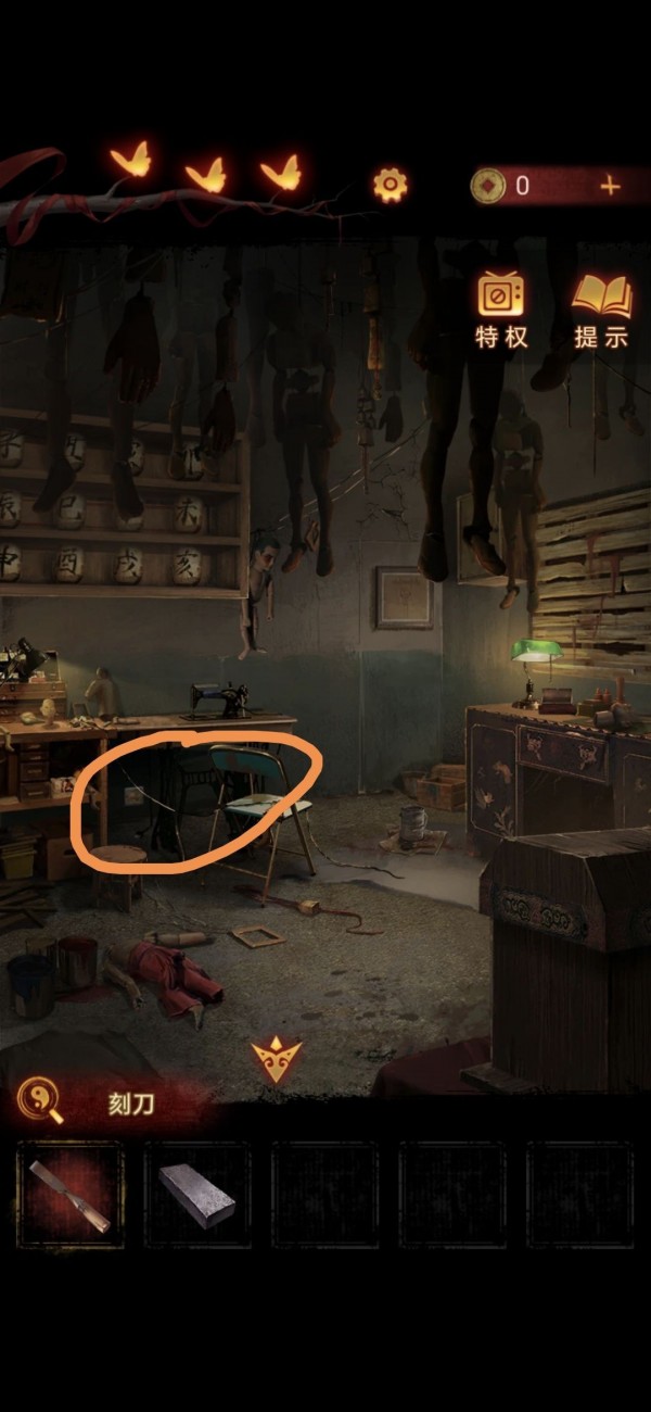 点击椅子,用切肉刀在脸上刻眼睛,娃娃呕吐,拿到钥匙。