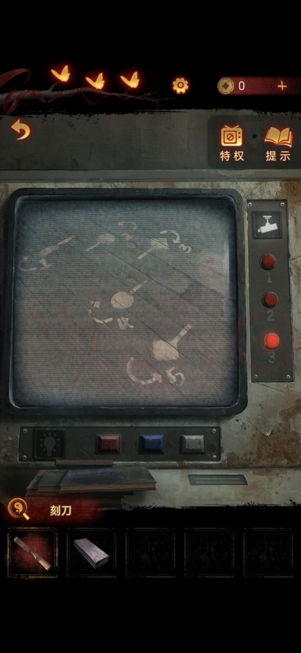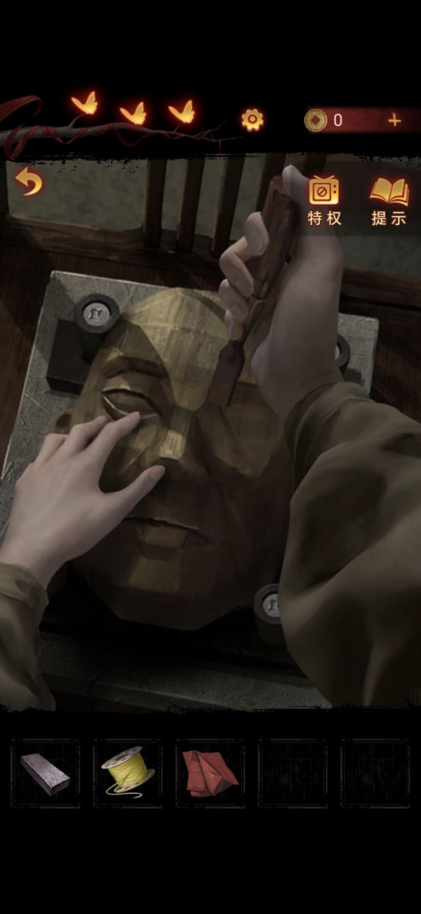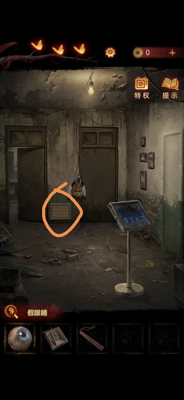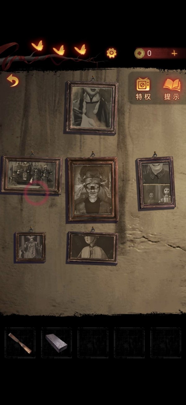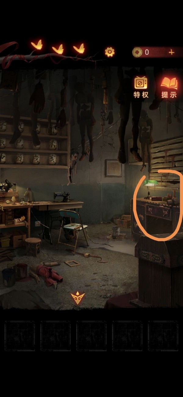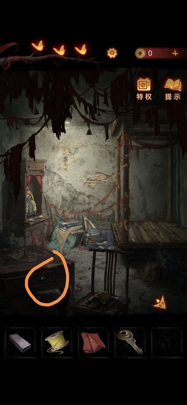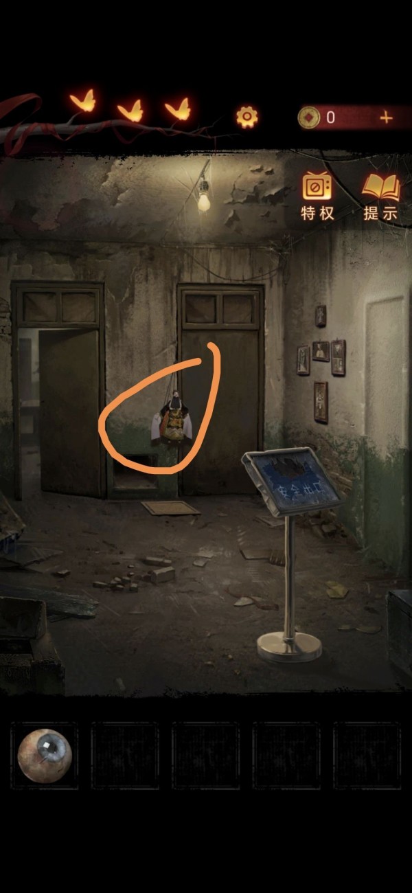 点击椅子,用切肉刀在脸上刻眼睛,娃娃呕吐,拿到钥匙。