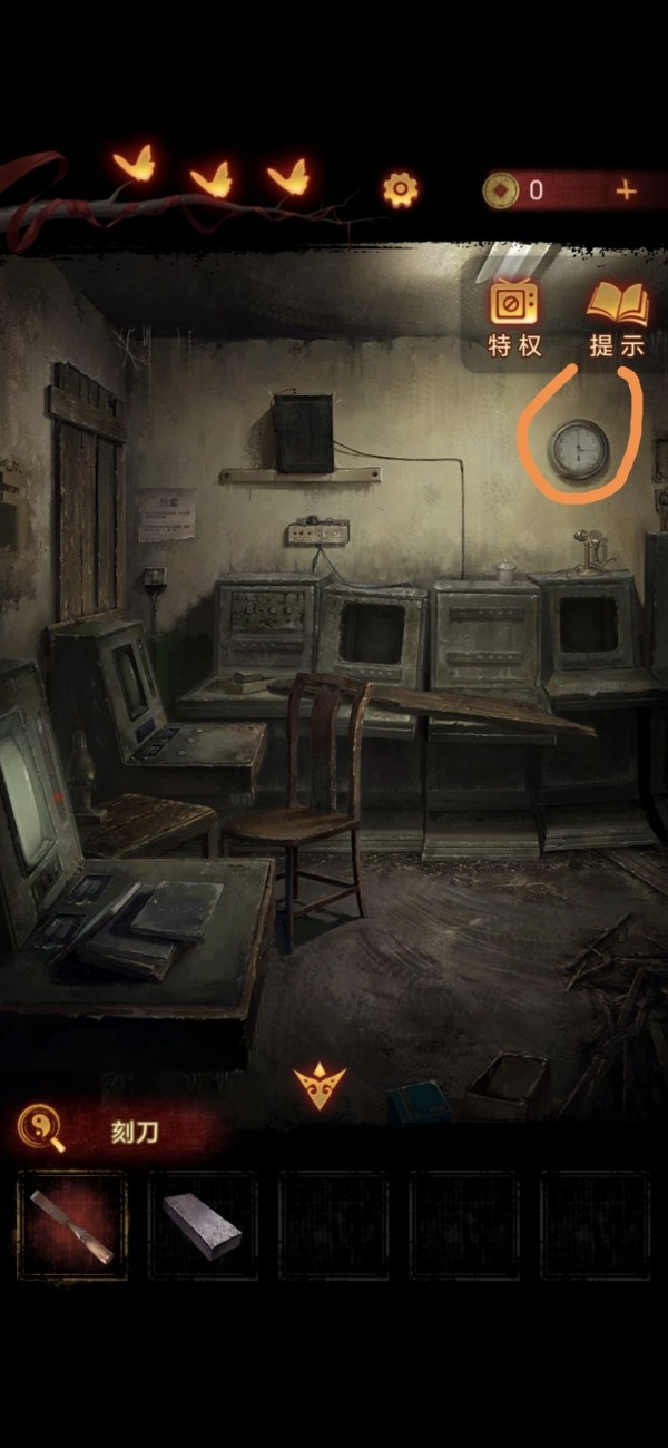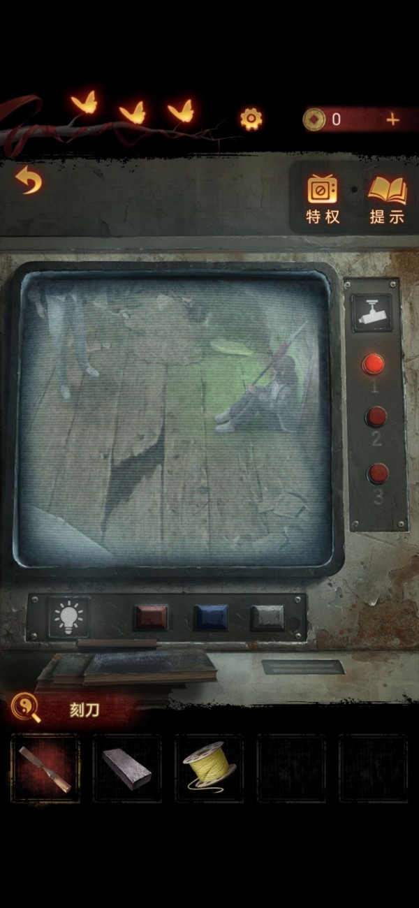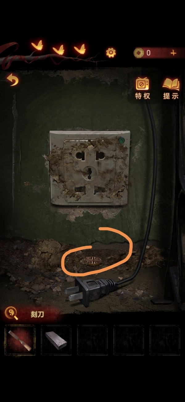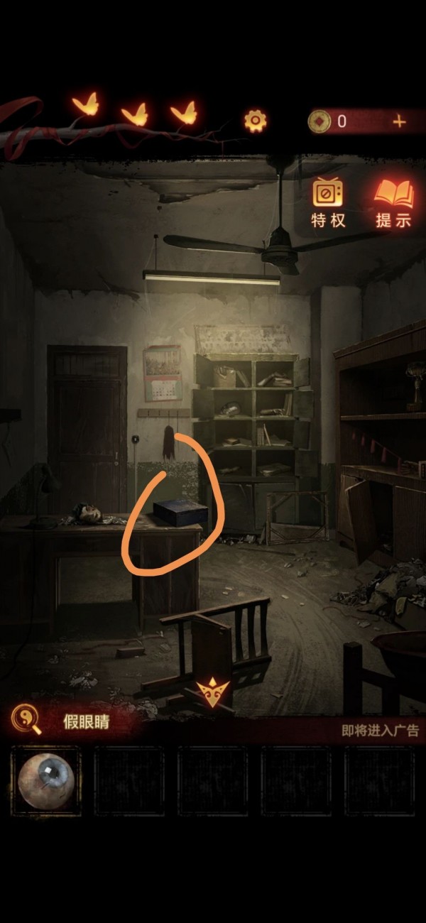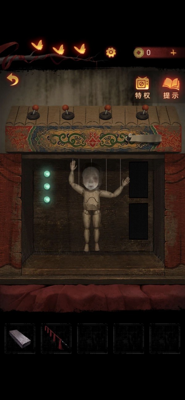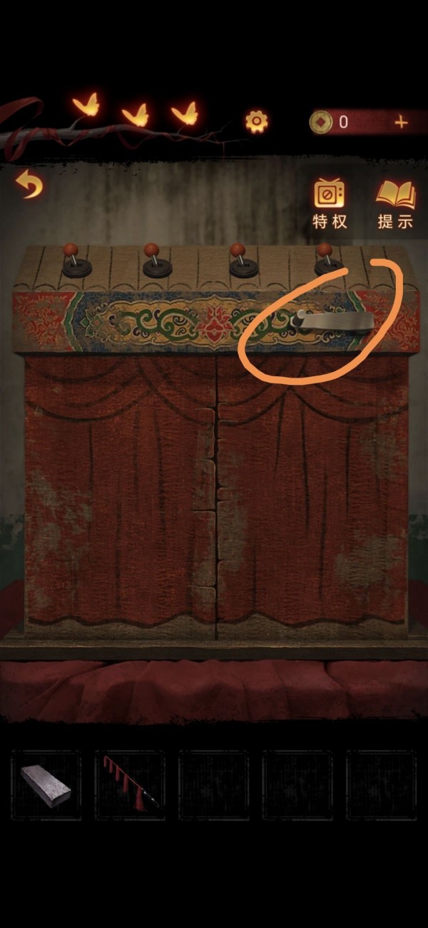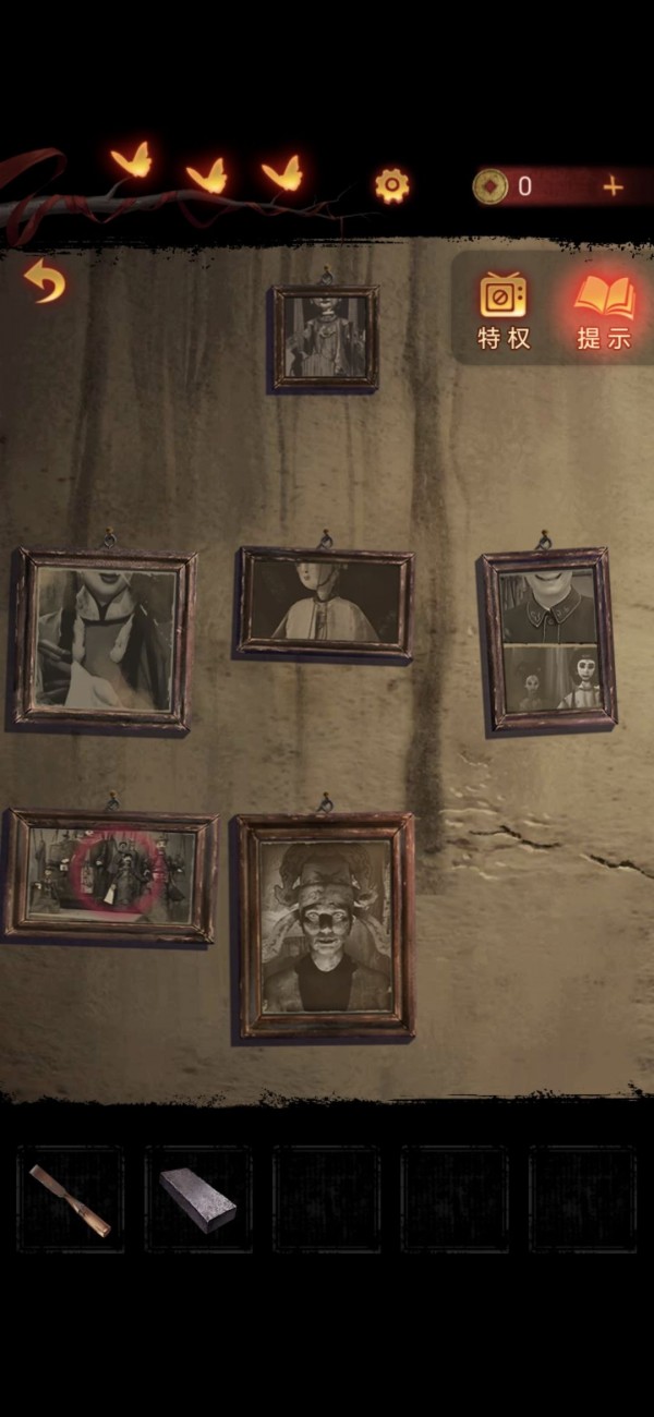 点击椅子,用切肉刀在脸上刻眼睛,娃娃呕吐,拿到钥匙。