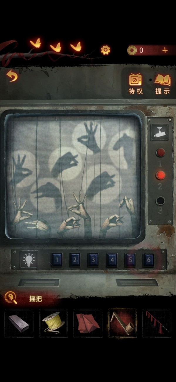 将手柄插入播放盒,玩一个小游戏,根据画面调整姿势,然后木偶伸出舌头去拿面具。